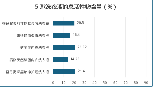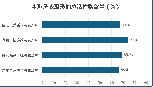 QB/T 1224-2012 《衣料用液体洗涤剂》规定,洗衣液产品类型分:丝毛洗衣液、普通型洗衣液、浓缩型洗衣液等,洗衣凝珠是新型的洗衣液属于浓缩型洗衣液。该标准对总活性物含量要求:洗衣液 普通型≥15%,洗衣液 浓缩型≥25%,丝毛洗衣液≥12%。5款洗衣液和4款洗衣凝珠的总活性物含量见下图,可以看出,普通型洗衣液(包括丝毛洗衣液)总活性物含量为:14.23%~21.4%,洗衣凝珠的总活性物含量高达66.2%~74.2%,洗衣凝珠的总活性物含量远高于普通洗衣液。