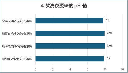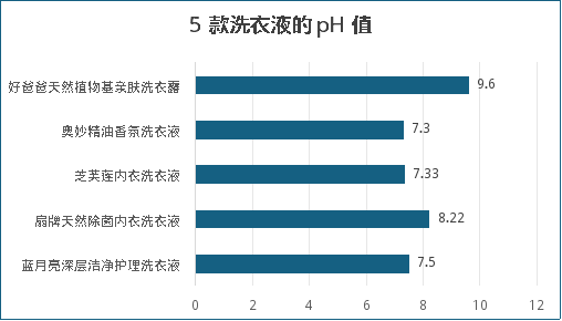 pH是检测洗衣产品的重要安全性指标,主要用于衡量产品酸碱度。QB/T 1224-2012 《衣料用液体洗涤剂》规定的pH值均≤10.5。根据表面活性剂的化学特性来说,pH越高活性越强去污力越好。对于人体健康来说,pH在6-8是无害的,pH值越高伤害越大,如有洗衣液残留在衣物上会引起皮肤干涩发痒等症状。