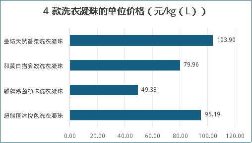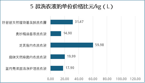 用样品的销售单价除以商品质量(体积)获得商品的单位价格值,单位价格值越小样品越便宜,反之越贵。评价结果见下图,可以看出,“金纺”样品最贵为103.9元/kg,“奥妙”样品最便宜为14.9元/kg。按不同产品类型比较,洗衣液样品价格:芝芙莲>好爸爸>扇牌>蓝月亮>奥妙;洗衣凝珠样品价格:金纺>超能>和黄白猫>雕牌。
