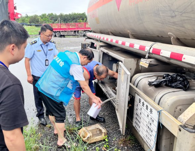 桂林市市场监管局执法人员和质检人员对成品油进行抽检