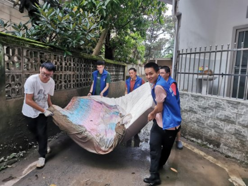 党员志愿者清理受被洪水浸泡损坏的床垫(莫晓敏摄)